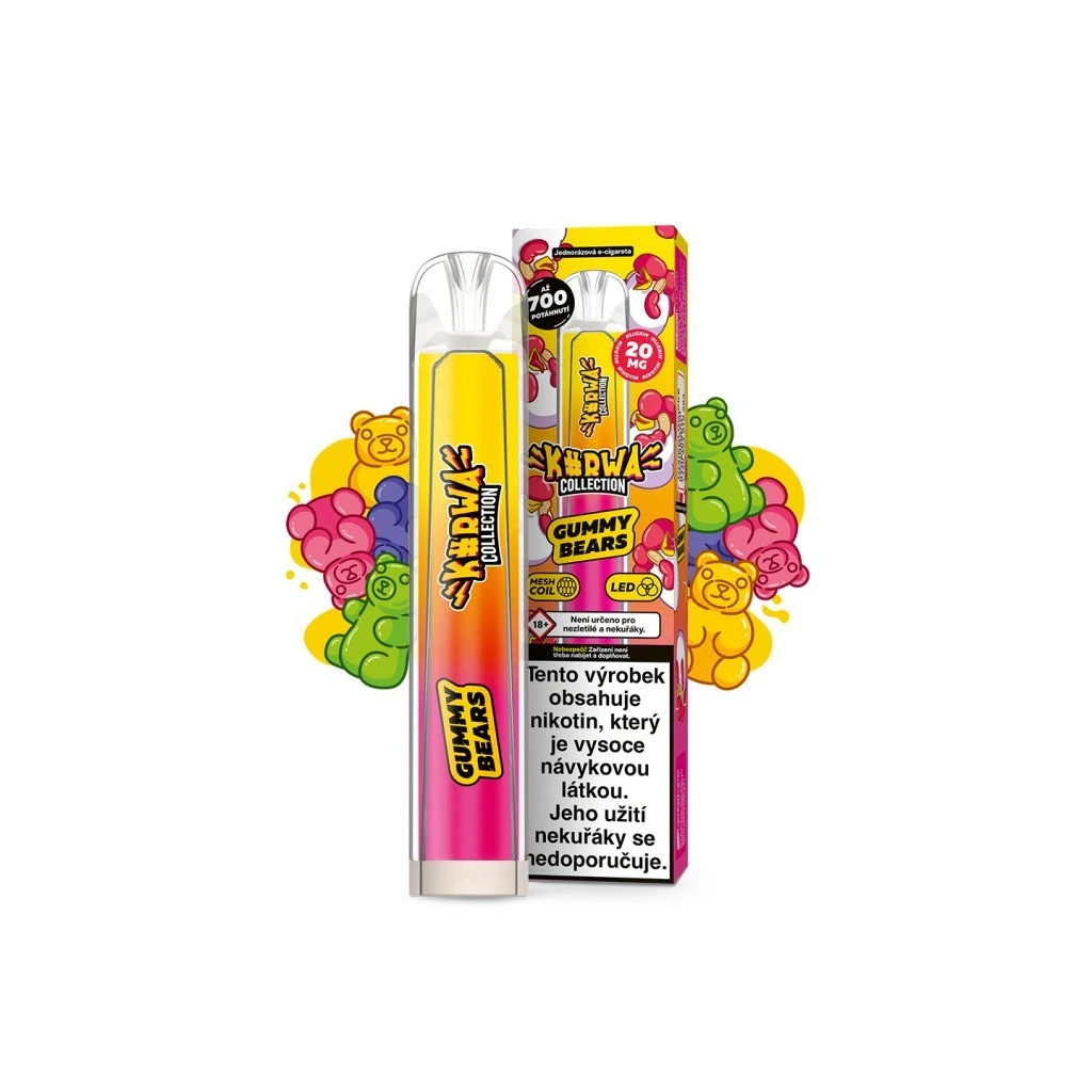 Diskrétní síla bez kouře. KURWA COLLECTION GUMMY BEARS (gumoví medvídci) ti dá čistý kick a výraznou chuť. Příchuť: gumoví medvídci.