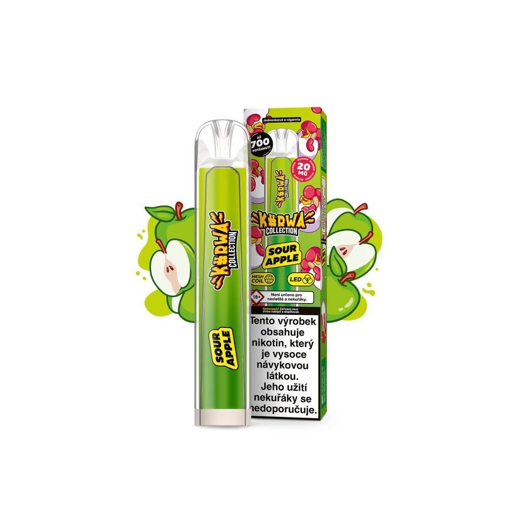 Diskrétní síla bez kouře. KURWA COLLECTION SOUR APPLE (kyselé jablko) ti dá čistý kick a výraznou chuť. Příchuť: jablko.