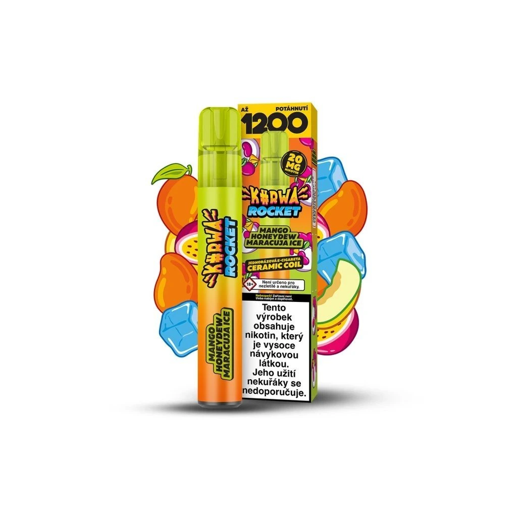 Diskrétní síla bez kouře. KURWA ROCKET MANGO HONEYDEW MARACUJA ICE ti dá čistý kick a výraznou chuť. Příchuť: tropické mango, ice.
