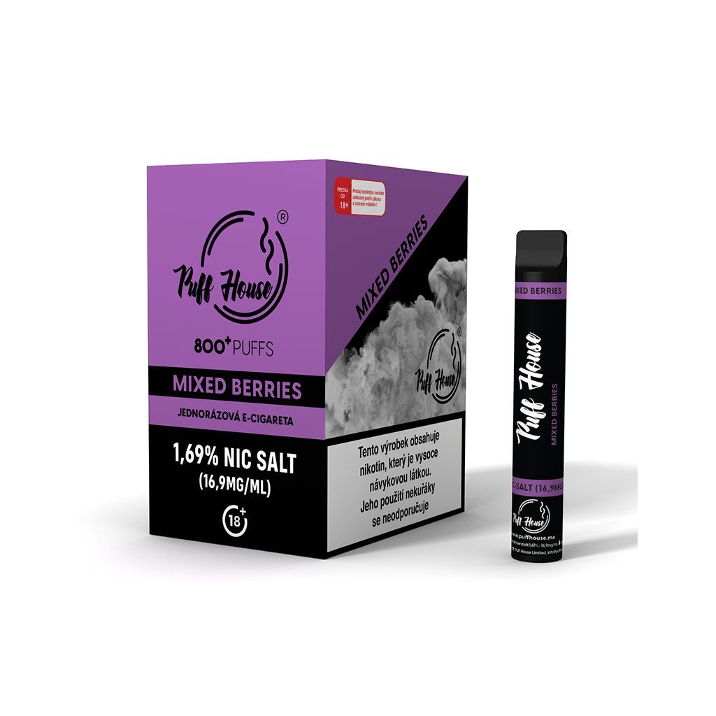 Okamžitě připraveno, žádné starosti. PUFF HOUSE MIXED BERRIES (směs lesních plodů) – rozbal a vapuj. Až 800 potahů. Příchuť: směs lesních plodů.