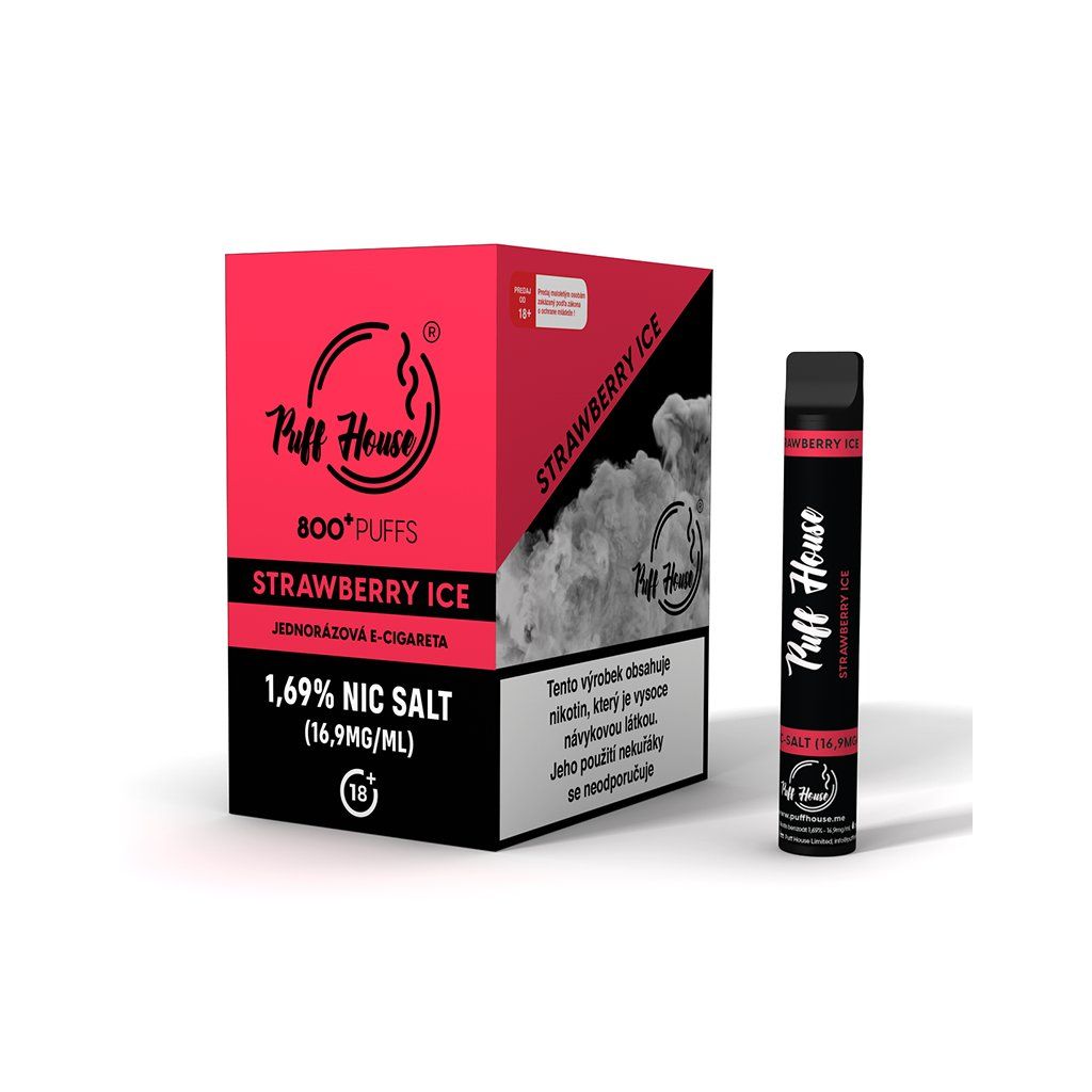 Okamžitě připraveno, žádné starosti. PUFF HOUSE STRAWBERRY ICE (ledová jahoda) – rozbal a vapuj. Až 800 potahů. Příchuť: jahoda, ice.