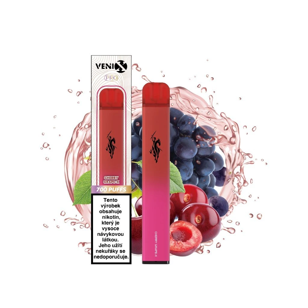 Okamžitě připraveno, žádné starosti. VENIX PRO CHERRY GRAPE-X – rozbal a vapuj. Až 700 potahů. Příchuť: hroznové víno, třešeň.